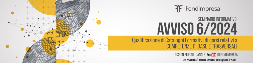 Con il seminario informativo dedicato all'Avviso 6/2024 Fondimpresa si propone di illustrare le novità relative alla Qualificazione di Cataloghi Formativi di corsi destinati allo sviluppo delle competenze di base e trasversali dei lavoratori delle aziende aderenti.