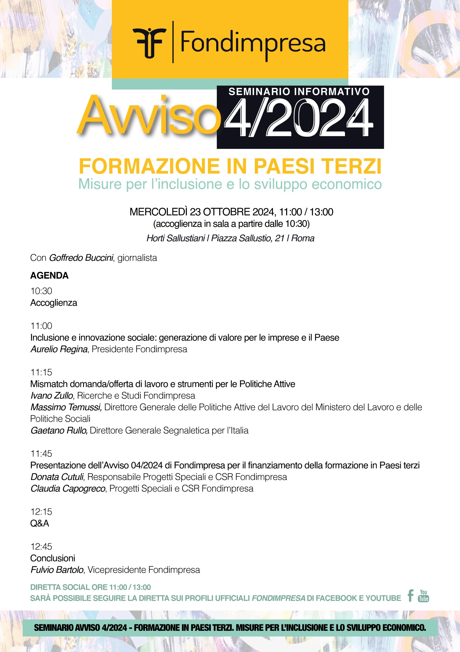 L'evento si terrà il 23 ottobre prossimo, dalle 11:00 alle 13:00, presso gli Horti Sallustiani in Piazza Sallustio, 21 a Roma, con la possibilità di seguirlo in diretta sui canali ufficiali di Fondimpresa su Facebook e YouTube.