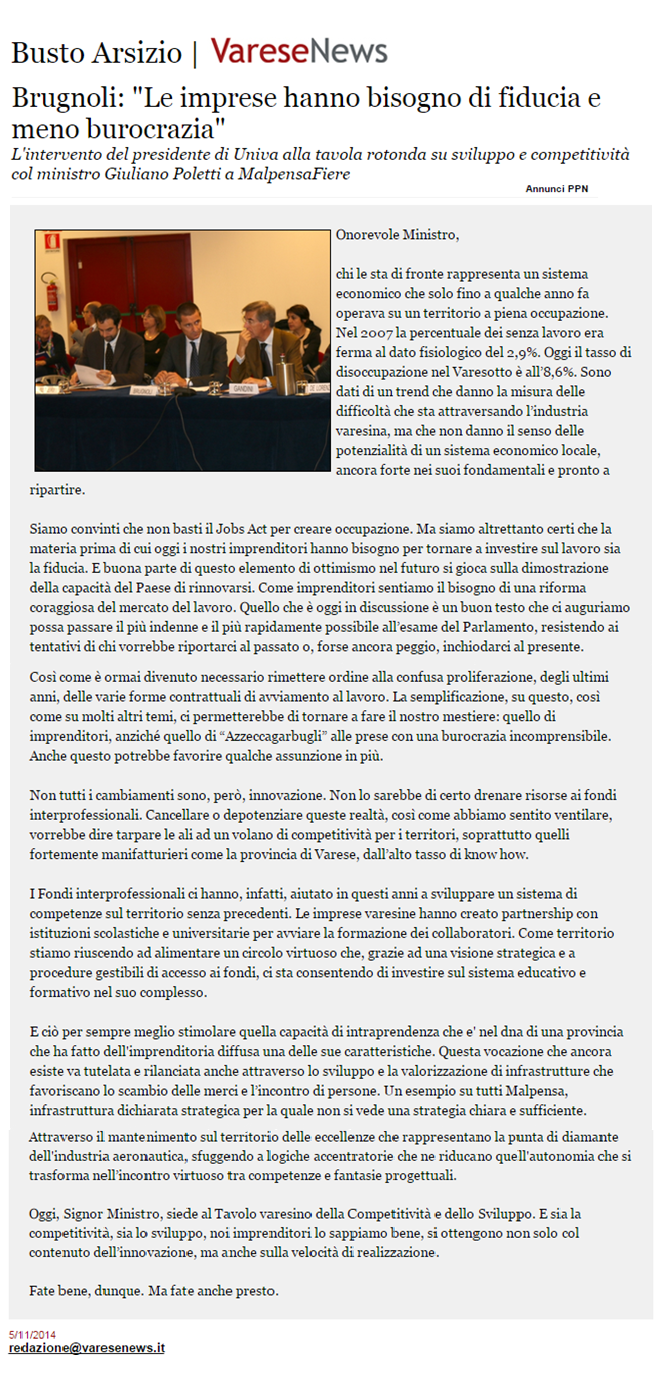 - Brugnoli:"Le imprese hanno bisogno di fiducia e meno burocrazia"Testata: VareseNews